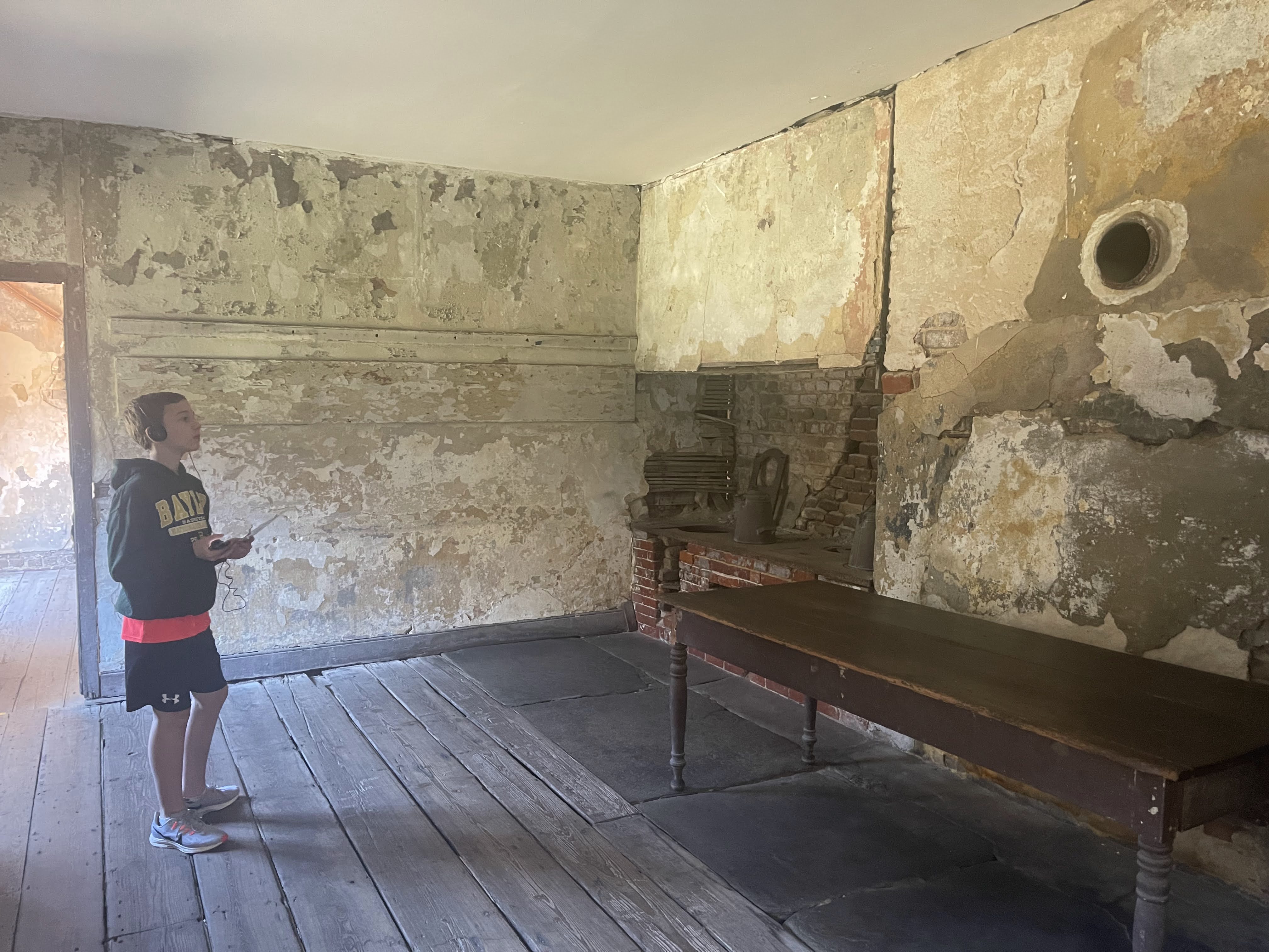 Caden listening to the audio tour in the building that housed the kitchen and servants' quarters.
